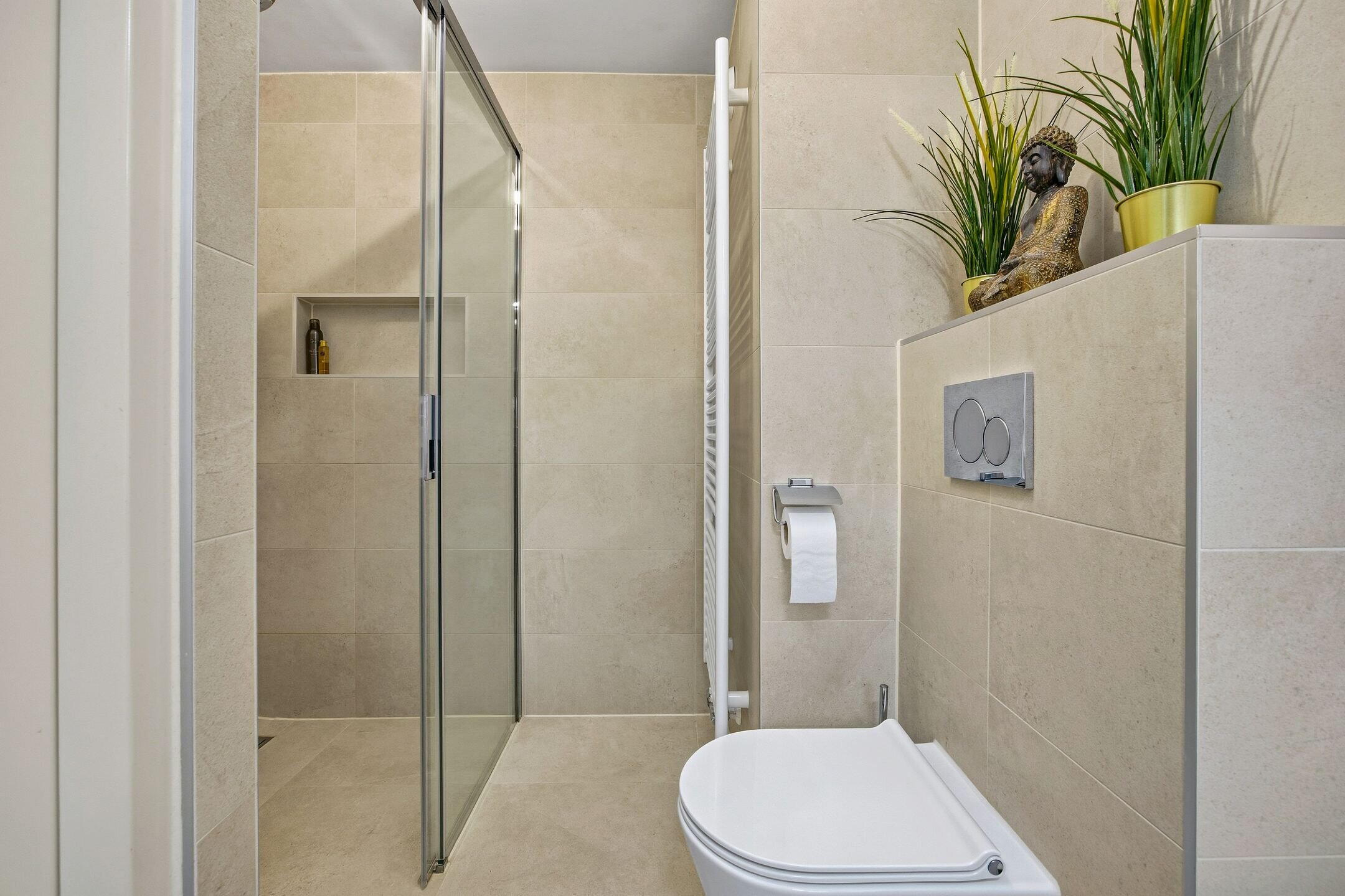 De vernieuwde badkamer is stijlvol uitgevoerd met een inloopdouche (regendouche en handdouche), hangend toilet en wastafel.