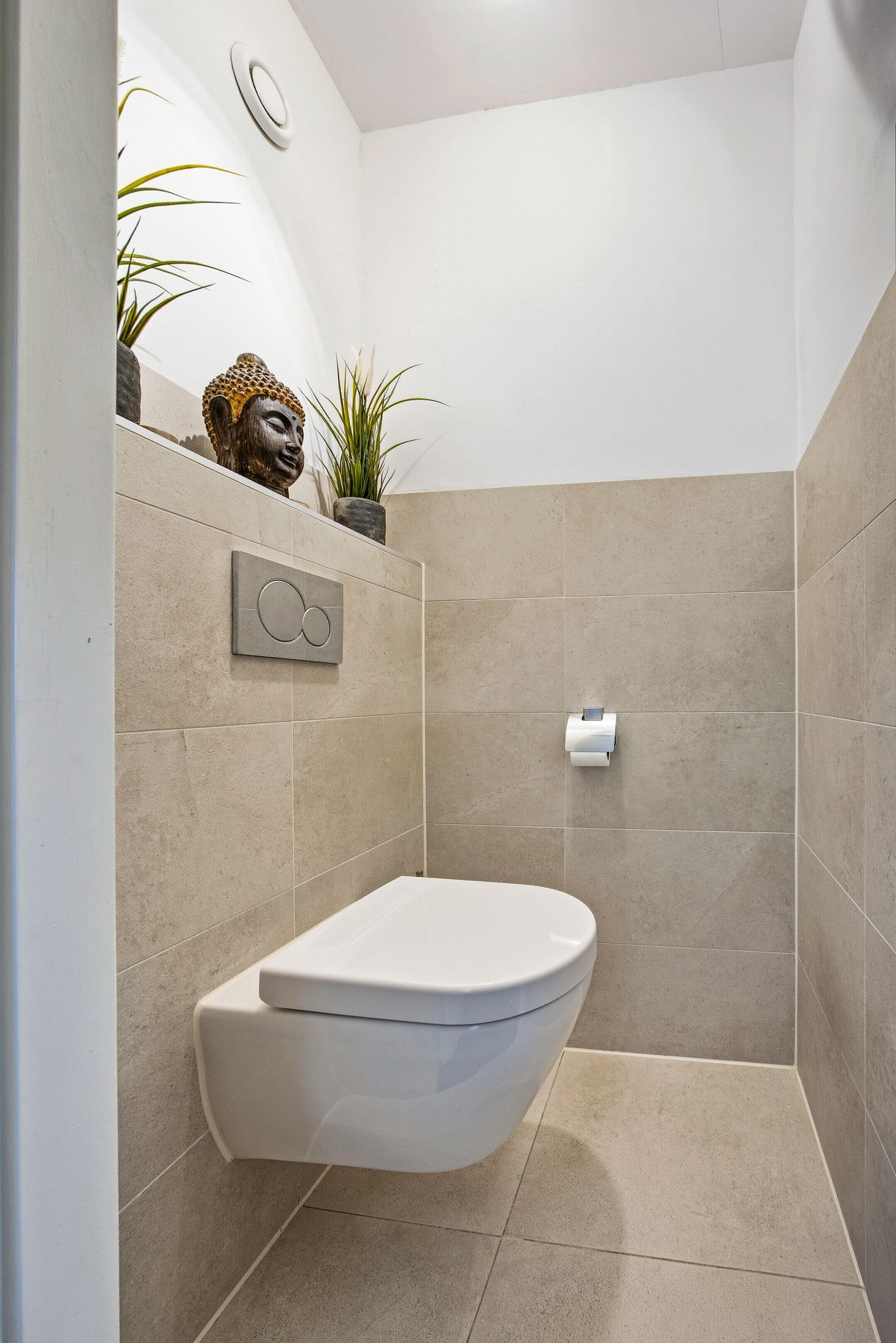 Via de entree kom je in de hal met moderne laminaatvloer, meterkast (stadsverwarming) en een modern toilet met hangend closet. Vanuit hier bereik je de bijkeuken/werkkamer en de trap naar de eerste verdieping.